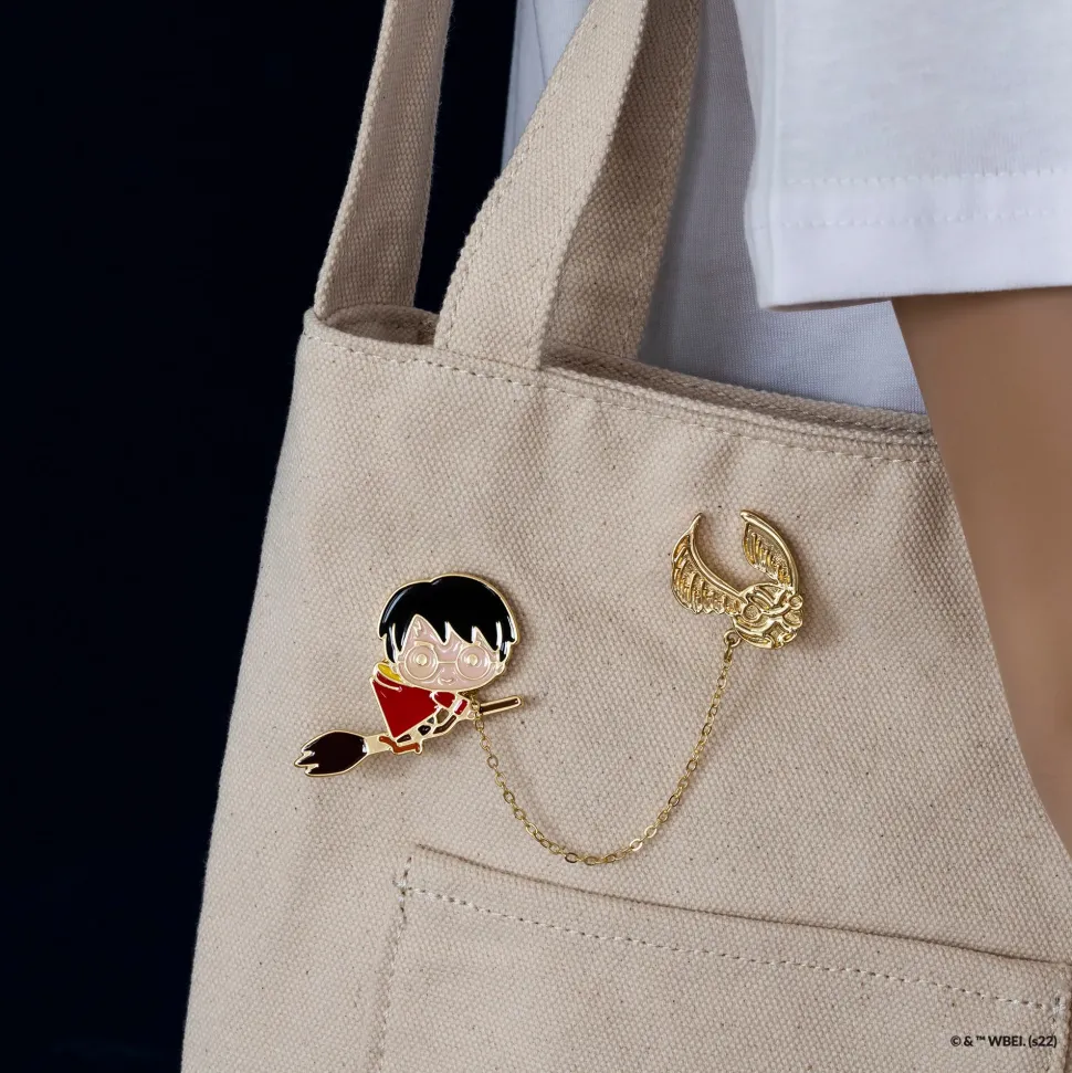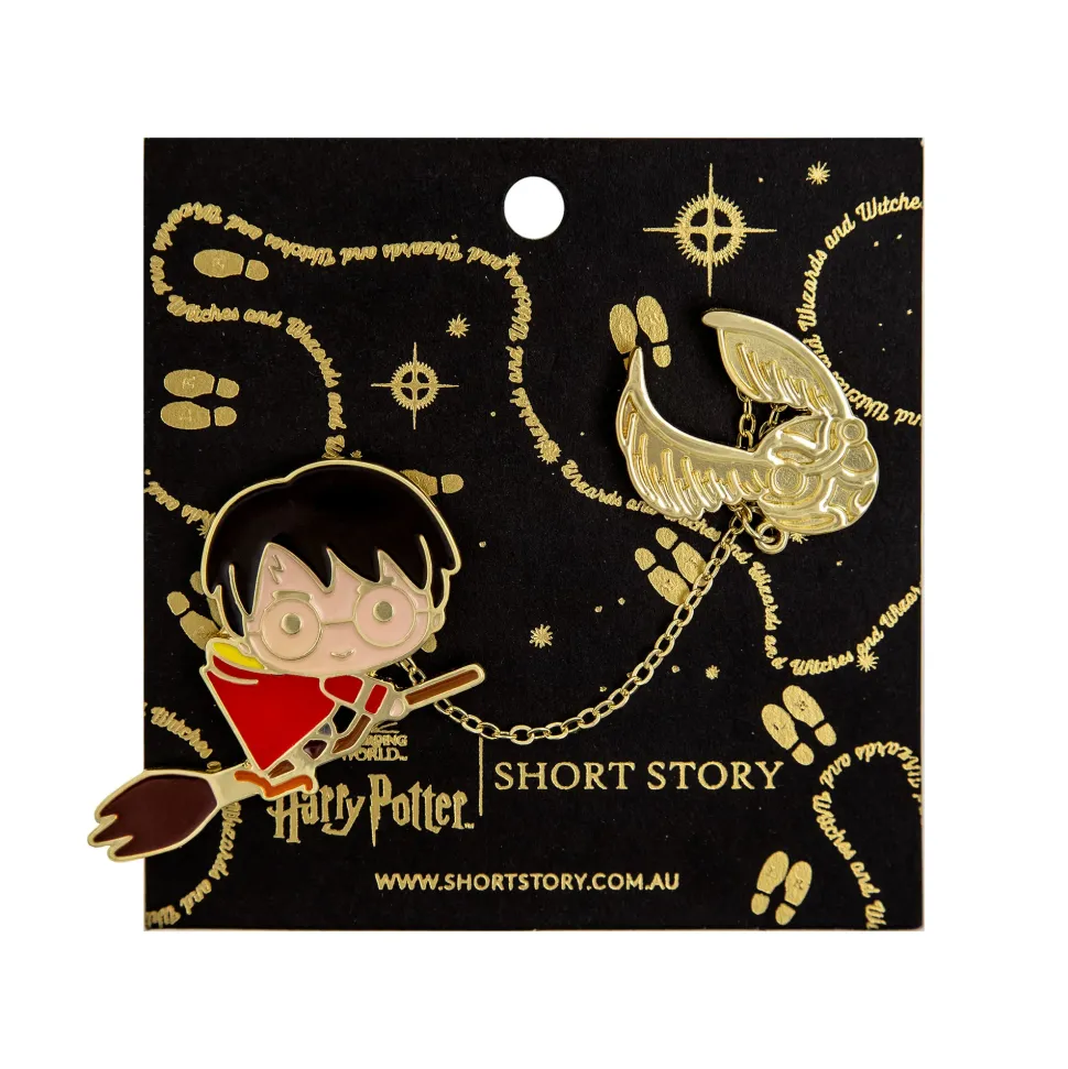 Grab your broomsticks & recall the riveting chase for the Golden Snitch™ with this nifty Harry Potter™ & Golden Snitch chain enamel pin.